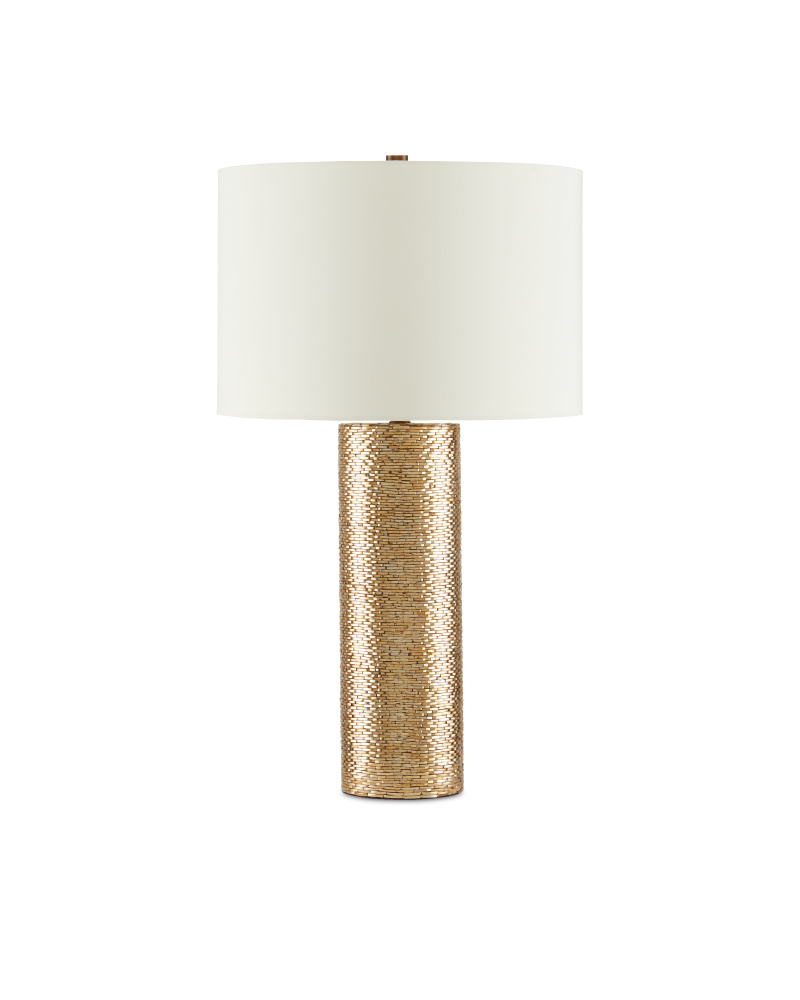 The Glimmer Gold Table Lamp has a textural exterior created by a mosaic of broken-glass bangle bracelets from India that were in pieces when they were hand-applied. The uniformity of the surface of the column requires a painstaking process that takes hours to achieve. The mosaic, which is applied to a wood structure, shimmers given it is made of glass.
