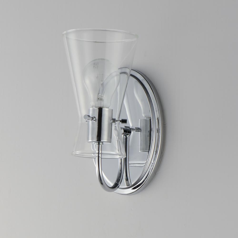 Suspended by three pin connections, the sharp silhouette of Ava's angular glass provides a designer look to enhance your bathroom design. Using Clear glass and a variety of complementary metal finishes the sconces are available in Black, Polished Chrom