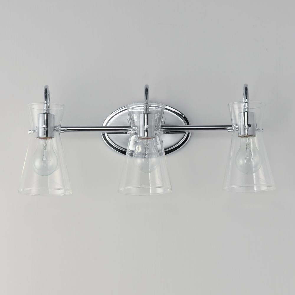 Suspended by three pin connections, the sharp silhouette of Ava's angular glass provides a designer look to enhance your bathroom design. Using Clear glass and a variety of complementary metal finishes the sconces are available in Black, Polished Chrom