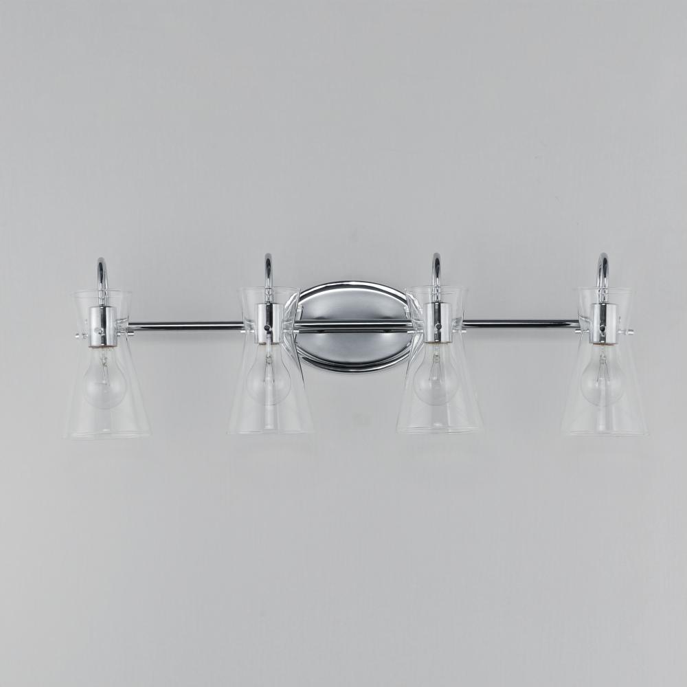 Suspended by three pin connections, the sharp silhouette of Ava's angular glass provides a designer look to enhance your bathroom design. Using Clear glass and a variety of complementary metal finishes the sconces are available in Black, Polished Chrom