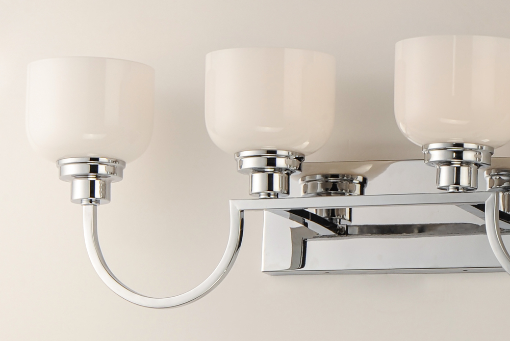 Square tube arms curve to form arcs of Polished Chrome in an interesting and unique fashion. White opal glass shades complete this clean design and provide a soft even illumination. Can be installed up or down.